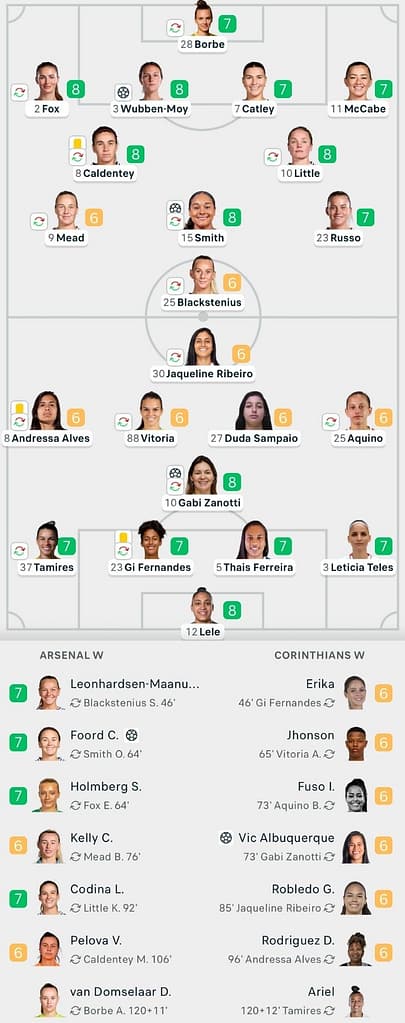 Arsenal pressed hard for a second before the break. Lele stood firm, denying Alessia Russo once and Beth Mead twice to keep Corinthians alive.