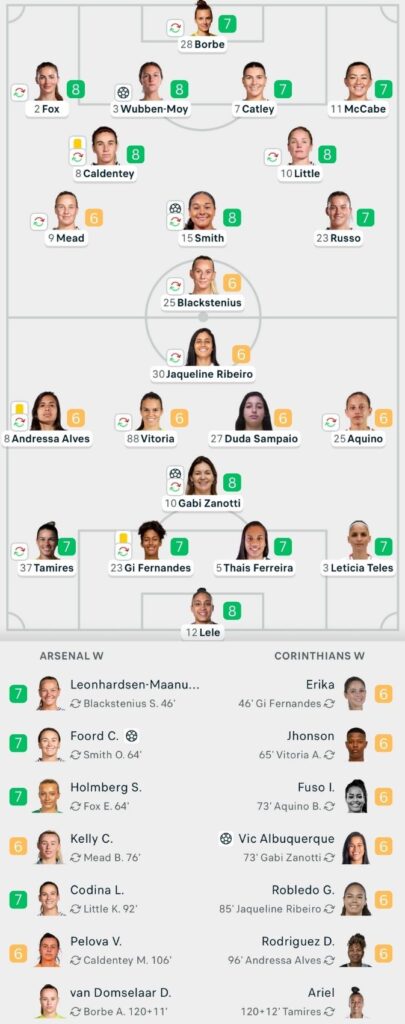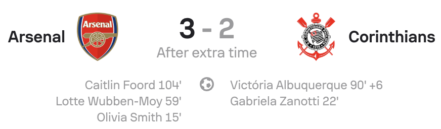 Arsenal pressed hard for a second before the break. Lele stood firm, denying Alessia Russo once and Beth Mead twice to keep Corinthians alive.