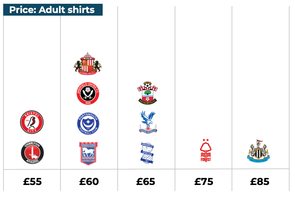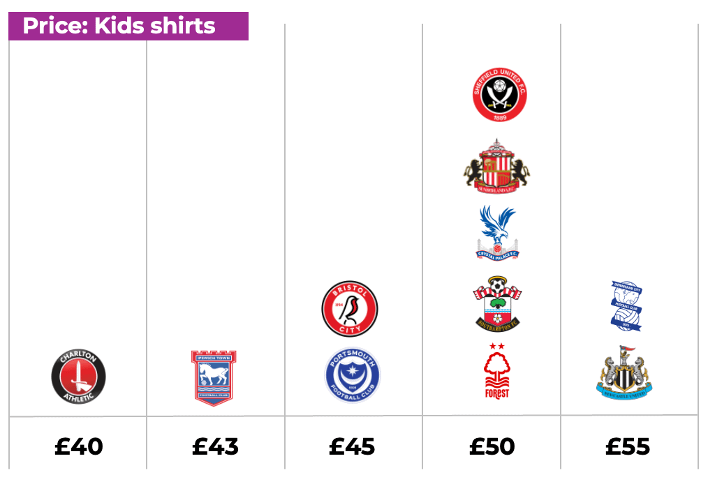 Charlton lead the way again, pricing their kids’ shirts at £40. Most others sit at £50, making the Addicks around 20% cheaper.