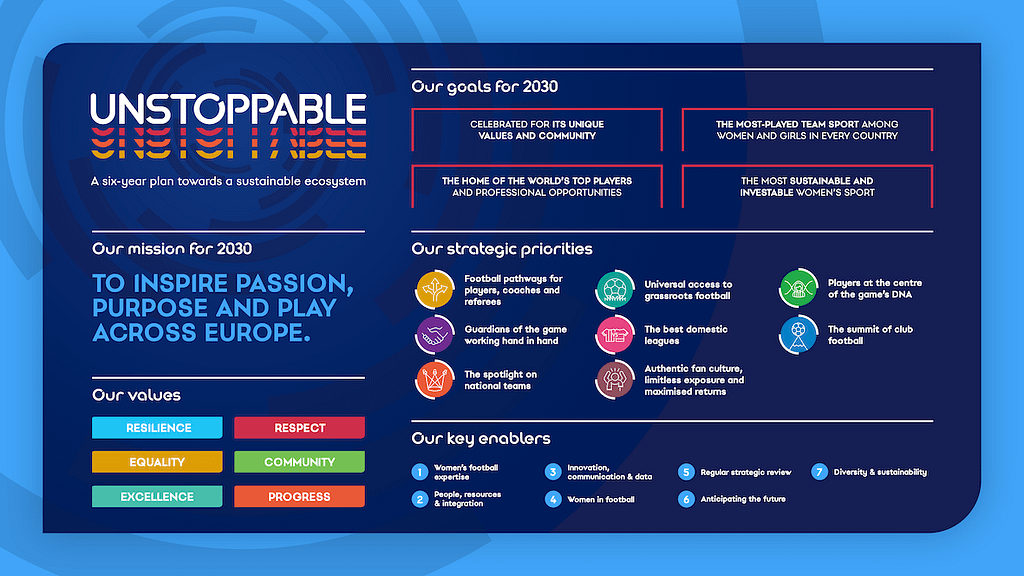 The Unstoppable strategy focusses on four long-term aspirational goals, that UEFA says they will be striving for women’s football in 2030 to be: