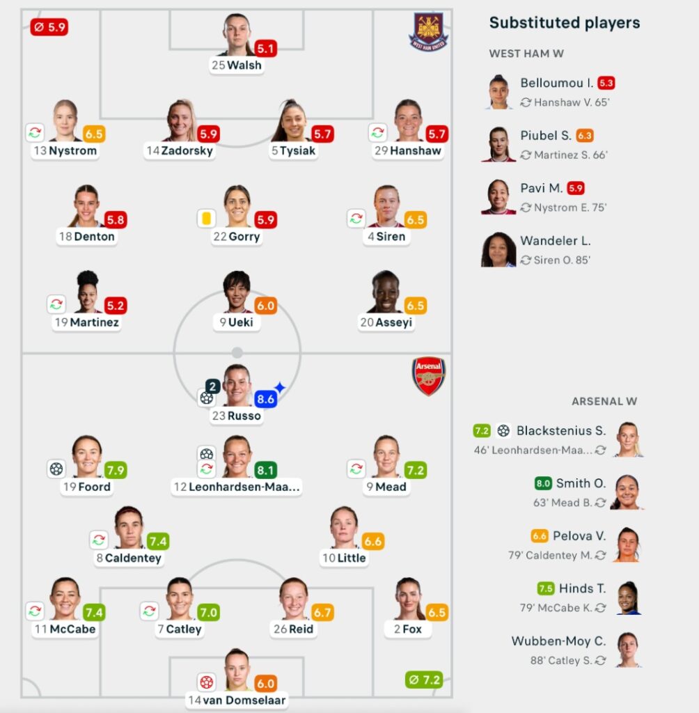 With West Ham struggling to cope, Russo sealed the win with a late double (90′, 90′+3 pen) – first rifling in from the edge of the box, then calmly dispatching a stoppage-time penalty she had won herself. Arsenal’s second-half blitz left the hosts reeling, and underlined why Jonas Eidevall’s side are already looking like serious title contenders.