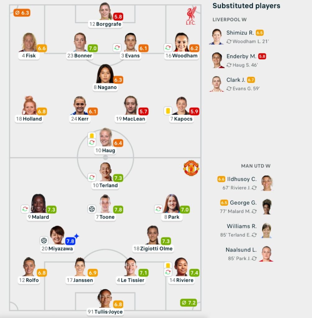 United struck again moments later. Ella Toone with a clinical finish on the stroke of half time giving the visitors a comfortable two-goal cushion.