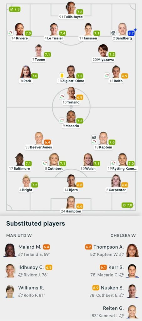 The visitors struck early, with Wieke Kaptein continuing her fine form by rifling into the bottom corner from close range after a clever backheel assist from Catarina Macario inside 10 minutes. But United responded in style. Just ten minutes later, full-back Anna Sandberg unleashed a thunderous strike from distance – another for the goal-of-the-season showreel.