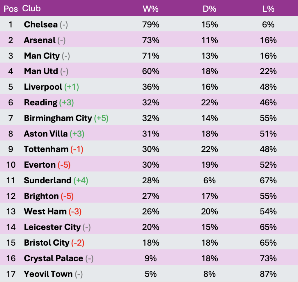 - Chelsea: 79% win rate, just 6% losses (absurd stat)