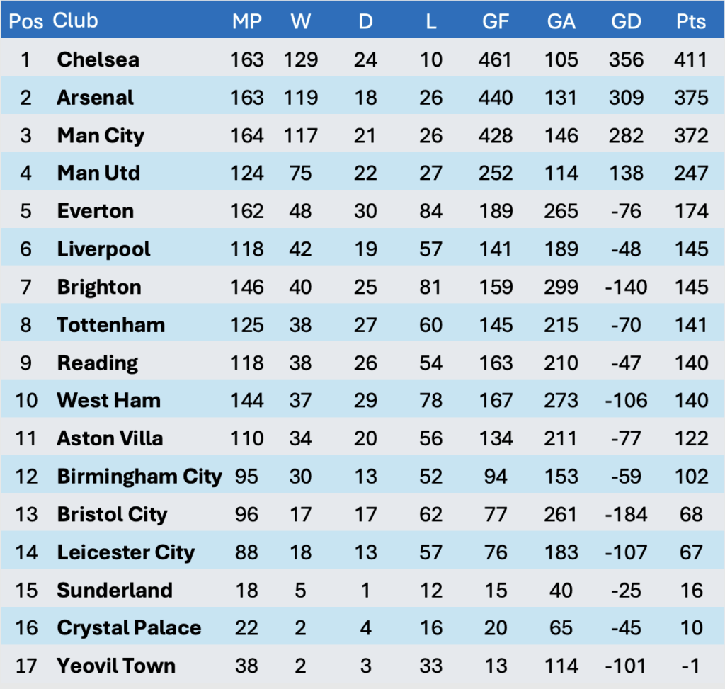 Chelsea sit top with 411 points, seven league titles, and a +356 goal difference. Arsenal, though only 10 wins behind overall, have just one title (2018–19) – a reminder that elite sport is defined by fine margins.