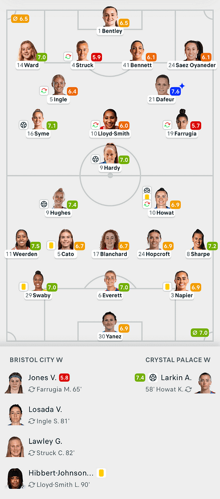 Early in the second half, Palace regained the lead, Howat’s deflected strike looping over Bentley to make it 2–1. Nevertheless, Bristol hit back swiftly. Emily Syme volleyed home expertly from Mari Ward’s delivery to level the tie again.