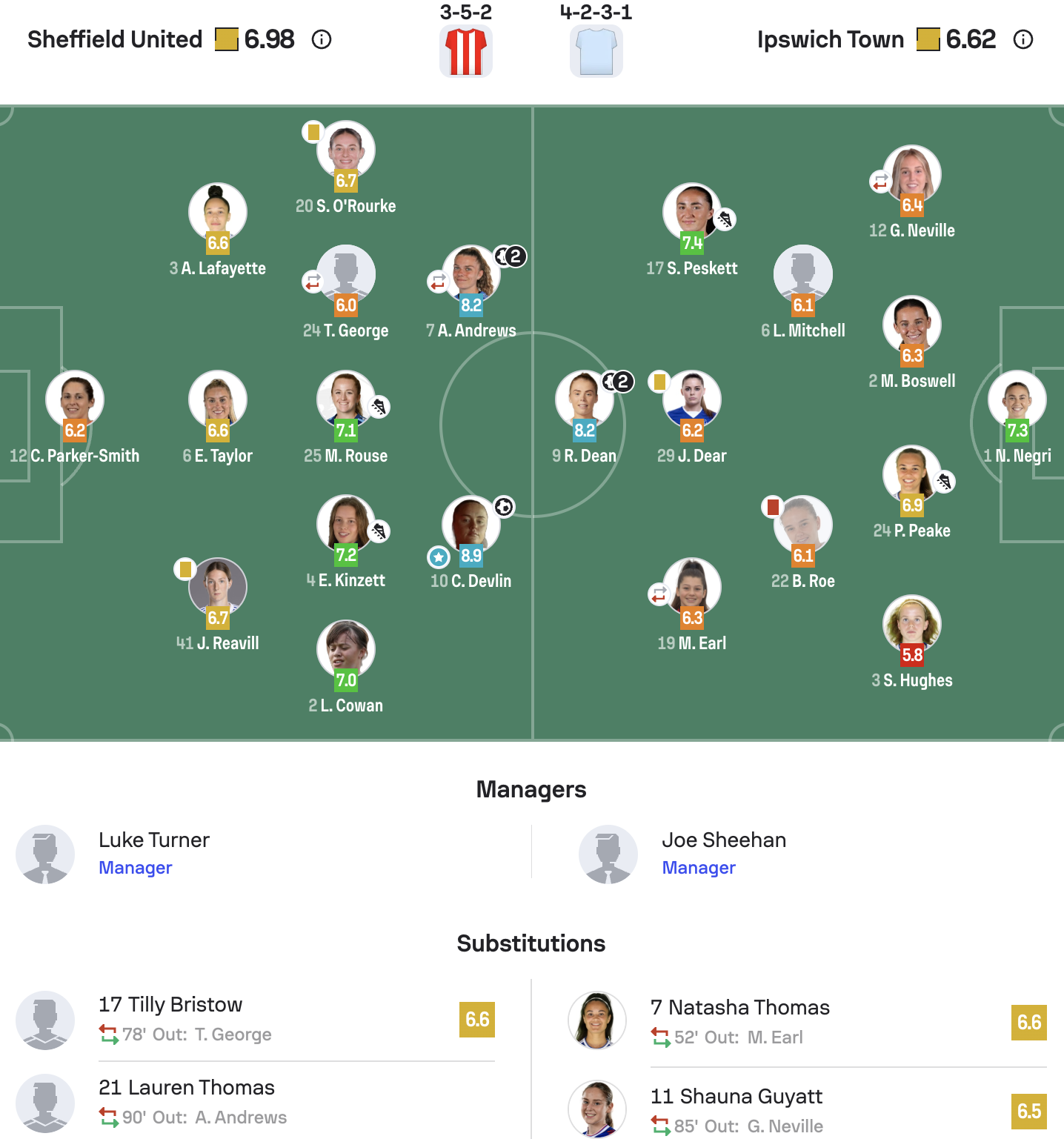 Sheffield then gave Ipswich a lifeline. Under minimal pressure, Charlotte Lafayette scuffed a back‑pass that fell to Peskett, who squared to Rianna Dean for an easy tap-in (53′). Seven minutes later, Dean struck again – a clinical header from a Lucy Peake cross following a failed clearance from a corner.